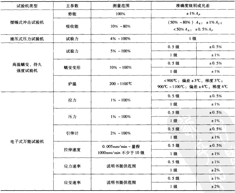 上述試驗(yàn)力規(guī)格、量程范圍的確定方法對(duì)其他類型或者測(cè)量項(xiàng)目的指標(biāo)選擇具有普遍指導(dǎo)意義。同樣,了解不同試驗(yàn)機(jī)各項(xiàng)技術(shù)指標(biāo)的測(cè)量范圍對(duì)用戶來(lái)說(shuō)是非常有幫助的。我們一擺錘式?jīng)_擊試驗(yàn)機(jī),液壓式拉力試驗(yàn)機(jī)、高溫蠕變、持久強(qiáng)度試驗(yàn)機(jī)和電子式萬(wàn)能試驗(yàn)機(jī)為例,通過(guò)下圖看出不同類的試驗(yàn)機(jī)具有不同技術(shù)指標(biāo),每項(xiàng)技術(shù)指標(biāo)都有相應(yīng)測(cè)量范圍及誤差限或擴(kuò)展不確定度。