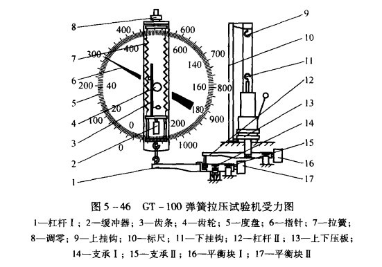 機(jī)械式彈簧拉壓試驗(yàn)機(jī)主要有兩種結(jié)構(gòu):a)量程可切換的拉壓試驗(yàn)機(jī) 以GT-100型為例,主要由試樣夾持機(jī)構(gòu),加荷機(jī)構(gòu),變形計(jì)量裝置和測(cè)力機(jī)構(gòu)組成。機(jī)座右邊裝有試樣夾持,加荷及變形計(jì)量機(jī)構(gòu)。左邊裝有彈簧式測(cè)力機(jī)構(gòu)及度盤。機(jī)座內(nèi)裝有傳遞杠桿及負(fù)荷變換機(jī)構(gòu)。機(jī)座支持在四個(gè)可調(diào)螺釘上,可調(diào)節(jié)機(jī)體水平度,如圖: