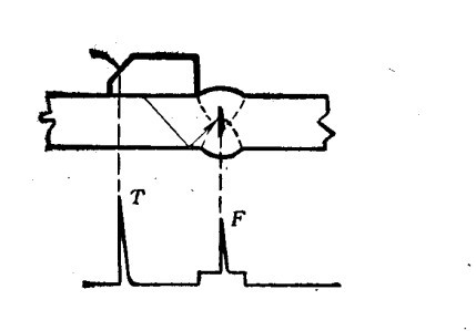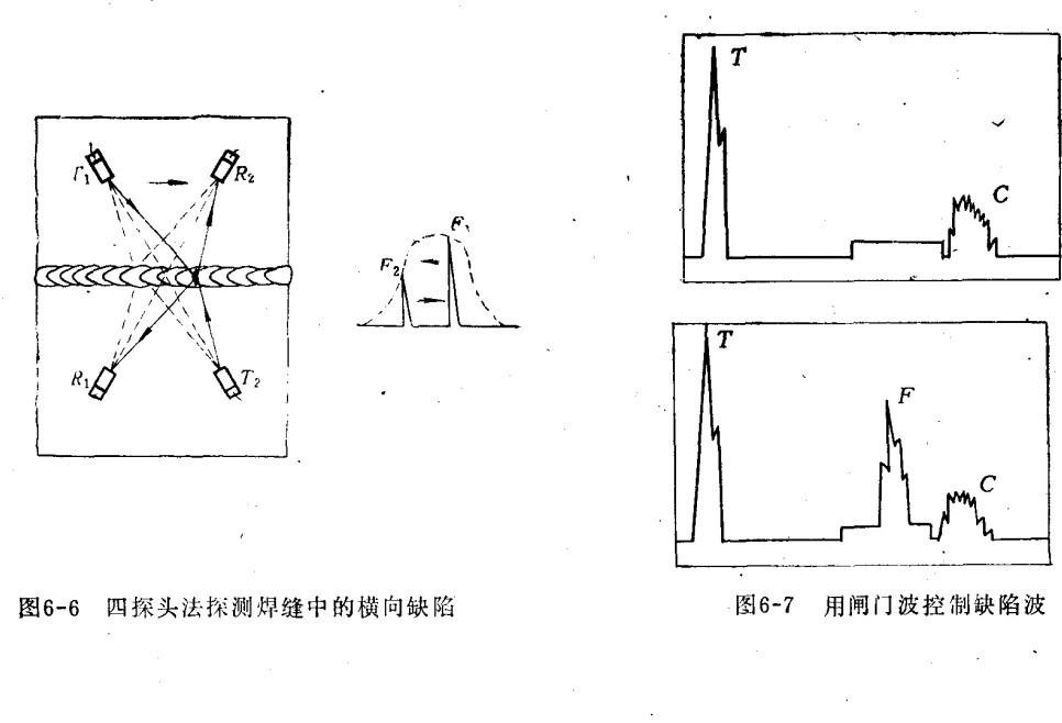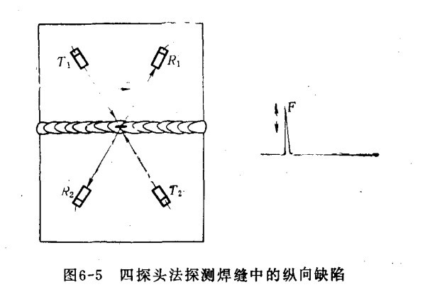 (二)四探頭法 四探頭法可探測厚度為4~12毫米的薄板對接焊縫中的裂紋、未焊透、條狀夾渣等缺陷。而且還可以進行探傷儀自動探測。四探頭法為兩組探頭(T為發(fā)射探頭,R為接收探頭),用機械固定并分別放在焊縫兩側(cè)(距焊縫軸線距離相等),探傷時沿焊縫同時移動。探測縱向缺陷時,T1R1為一組探頭,T2R2為一組當(dāng)焊縫中無缺陷時,熒光屏上只出現(xiàn)焊角反射波。如有缺陷,則在焊角反射波之前出現(xiàn)缺陷波F(如缺陷在焊縫中間,則兩組探頭所得缺陷波重疊在一起),探頭移動時,缺陷波的幅度改變。