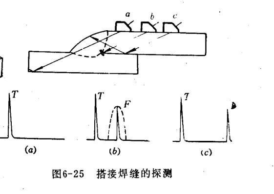 二、搭接焊縫探傷 搭接焊縫探傷可用下圖方法所示,探頭在c位置時(shí),熒光屏上出現(xiàn)焊角反射波。當(dāng)探頭向焊縫方向移動(dòng),聲波遇到缺陷時(shí),將出現(xiàn)缺陷波。超聲波探傷儀探頭在b位置時(shí),缺陷波最大,探頭由b向前移動(dòng)時(shí),缺陷波幅逐漸降低(缺陷波位置前移)。探頭在a位置時(shí),聲波透過(guò)焊縫,在下部板中傳播,熒光屏上無(wú)射波。