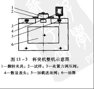 (2)試驗機(jī)解析 a)整機(jī)結(jié)構(gòu) 試驗機(jī)主機(jī)采用箱體式結(jié)構(gòu)形式,復(fù)合油缸安裝在箱體里的上部,下部為油源部分。試驗機(jī)驅(qū)動方式為:人工控制,液壓夾緊,液壓加荷,光柵尺測量位移,油壓傳感器測夾緊力和沖壓力,數(shù)碼顯示。整個系統(tǒng)合于一體,結(jié)構(gòu)緊湊,安裝方便,測試精度高。 b)工作原理 1)液壓系統(tǒng)與操作:該試驗機(jī)為液壓夾緊、液壓加載。