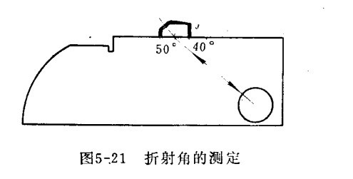 八、折射角的測定 如下圖示,探頭在J位置,移動超聲波探傷儀探頭,直到獲得從有機(jī)玻璃圓柱塊處反射回的波幅最高為止,此時探頭零點(diǎn)線在試塊上所指的角度即為其折射角度(入射點(diǎn)至有機(jī)玻璃圓柱塊中心的連線與零點(diǎn)線的夾角),試塊上刻有幾個固定的折射角。