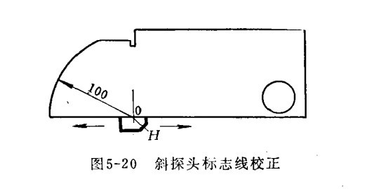 七、斜探頭波束零點(diǎn)線的校正 斜探頭有機(jī)玻璃楔塊上的零點(diǎn)線和壓電晶片的中心線重合。斜探頭在H位置移動,直到從100毫米弧度處獲得最大的反射波為止,如斜探頭零點(diǎn)線與試塊上0點(diǎn)重合,則斜探頭的零點(diǎn)線正確。否則,需移動探頭的晶片,直至重合為止。此時斜探頭的零點(diǎn)線即為聲波主線的入射點(diǎn)。