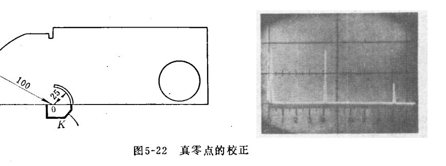 九、斜探頭真零點(diǎn)的校正 斜探頭聲波經(jīng)過有機(jī)玻璃延遲一段時間后,射入工件,這一段時間需在熒光屏零點(diǎn)刻度上予以校正。如下圖示,探頭在K處移動,直到獲得從100毫米弧度反射回的波幅最高為止,然后調(diào)整掃描線的“水平位移”及“細(xì)調(diào)”,使兩個反射波出現(xiàn)在40°及90°處為止??潭?0°的波系從100毫米處直接反射回探頭的波(路徑200毫米),而90°處的波系由100毫米處及25毫米槽處往復(fù)反射回至探頭的波(路徑450毫米)。此時,熒光屏的零點(diǎn)刻度即為聲波離開斜探頭有機(jī)玻璃楔塊時的零點(diǎn)。