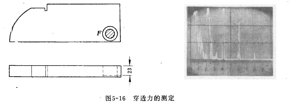 三、放大器線性的測定  如下圖所示,將超聲波探傷儀探頭放在F位置的有機(jī)玻璃塊上探測,有機(jī)玻璃的厚度相當(dāng)于50毫米鋼的厚度。測定時,靈敏度的控制由最小開至最大,高穿透力儀器有6~10個反射波,低穿透力的儀器只有2~4個反射波。