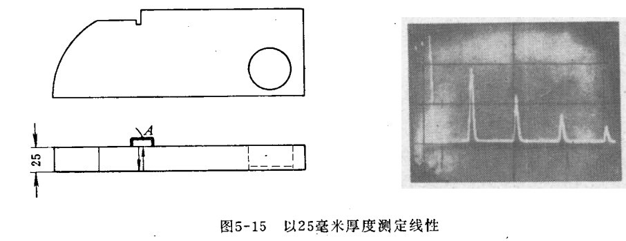 二、時間基線(掃描線)線性的測定  用直探頭(縱波)測定,發(fā)射波調(diào)整在熒光屏的零點(diǎn)上。例如時間基線為0~100毫米時,將探頭放在試塊的A位置,以25毫米的多次反射波進(jìn)行校正。微調(diào)掃描速度,使第一次反射波出現(xiàn)在25處,如果掃描線性好,第二、三、四次應(yīng)分別與50、75、100刻度重合。否則多次反射波不成比例的出現(xiàn)在熒光屏上。